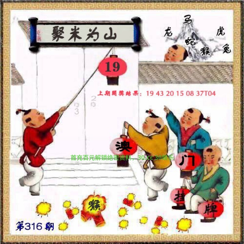 316期正版彩图挂牌:挂:19 爆:猴 挂牌成语:聚米为山 挂牌出肖:马龙蛇虎兔猴